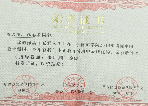 五年来,学院先后获评1次校级征兵先进单位、1次校级优秀学生会组织、1次校级五四红旗团支部等荣誉,涌现出全省“新时代学生心中的好老师”、全省“大学生创业计划竞赛”银奖、全省“挑战杯”一等奖、全校“教书育人”先进个人、全校“优秀辅导员”等先进集体和个人。