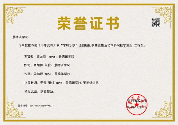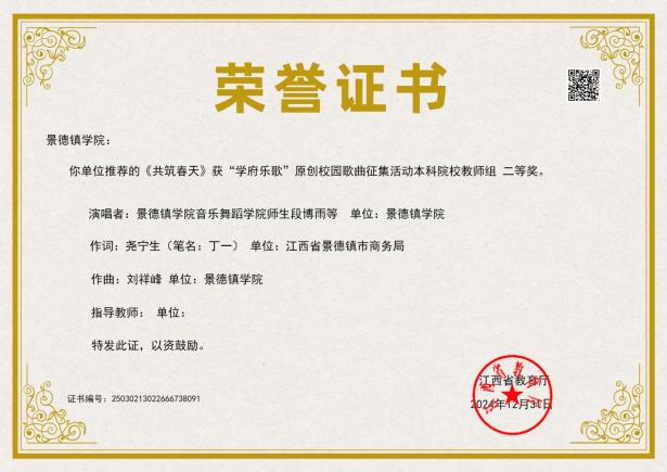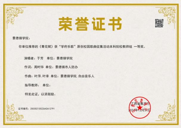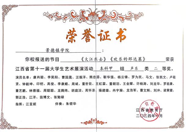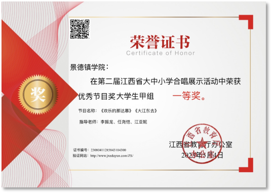 音乐舞蹈学院合唱团《天下乡亲》荣获“庆祝中华人民共和国成立75周年景德镇市第四十四届群众歌咏月活动”一等奖