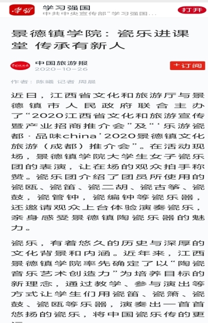 “罄音”瓷乐团被中国旅游报刊登题为《BEAT365英国官网:瓷乐进课堂 传承有新人》专题报道并被“学习强国”学习平台予以转载
