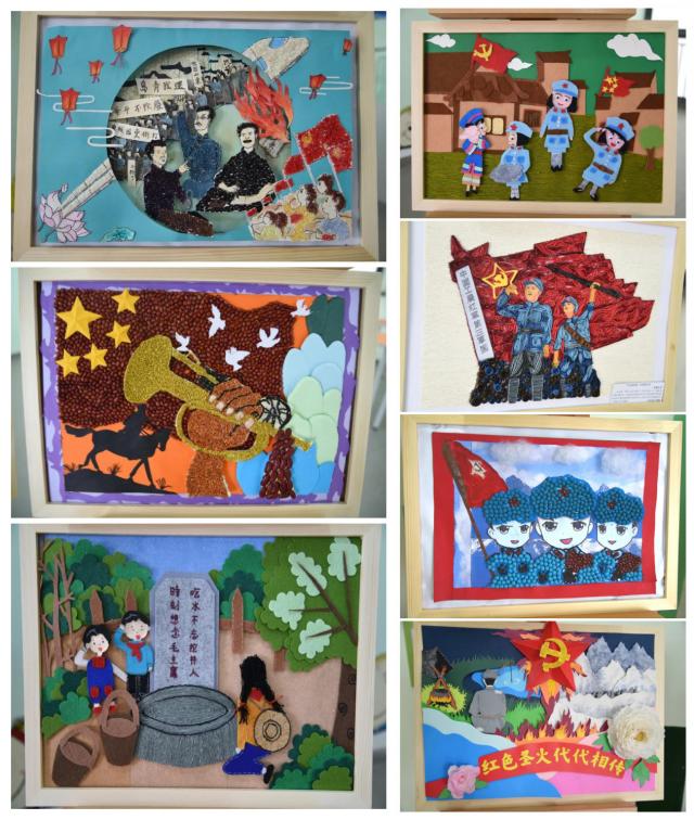 展出的作品呈现了中国共产党百年光辉历程中的重要历史人物、事件和成就等。师生以手工创作的形式运用衍纸、种子、布等材料,把对党史的理解、对党恩的感念融入作品设计中,凸显了共产党人任劳任怨、勇敢无畏、舍生取义的伟大精神,展示了红色文化,传递着红色力量。