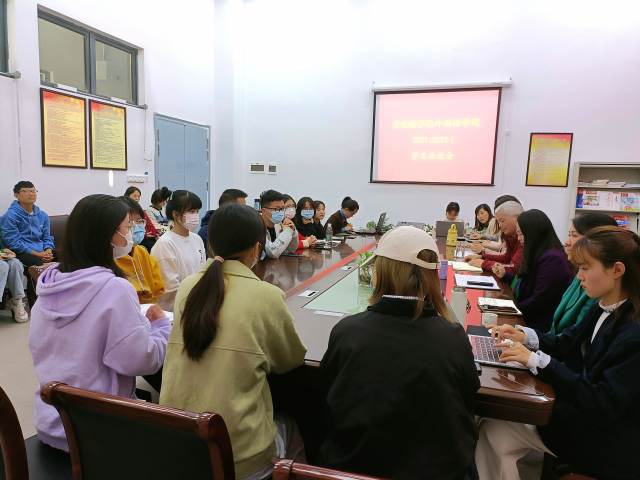 (本网讯:万丽佳)为解决好师生最关心、最直接、最现实的问题,扎实推进“我为师生办实事”实践活动,持续增强师生的获得感和幸福感,近日,外国语学院2021-2022学年第一学期学生座谈会在五楼会议室召开,外国语学院院长朱练平、党总支副书记吴芹参加会议,副院长夏小红主持会议。