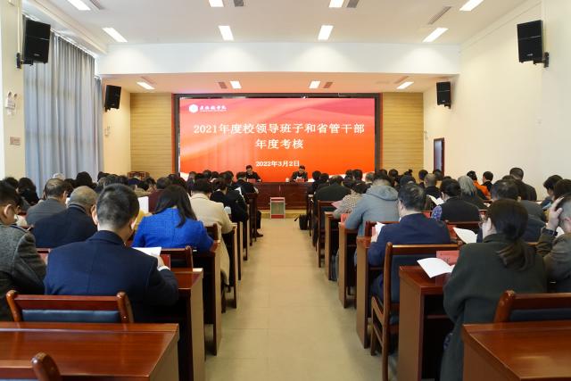 (本网讯:刘斌权、蔡新雅、邓舒馨)3月2日下午,学校在一号报告厅召开学校领导班子和省管领导干部2021年度考核民主测评会,省委第十一考核组组长、省人力资源和社会保障厅党组成员、副厅长叶志忠,考核组成员李雷、丁杰、...