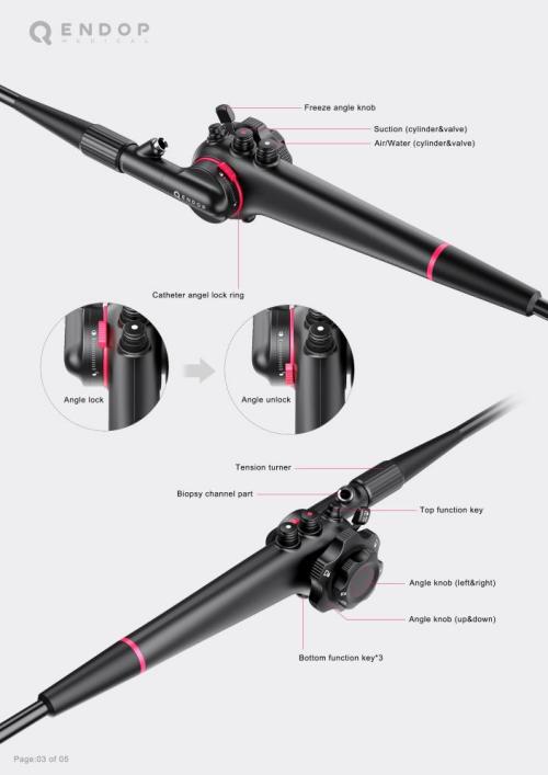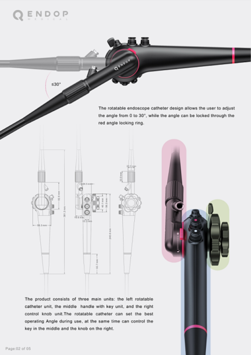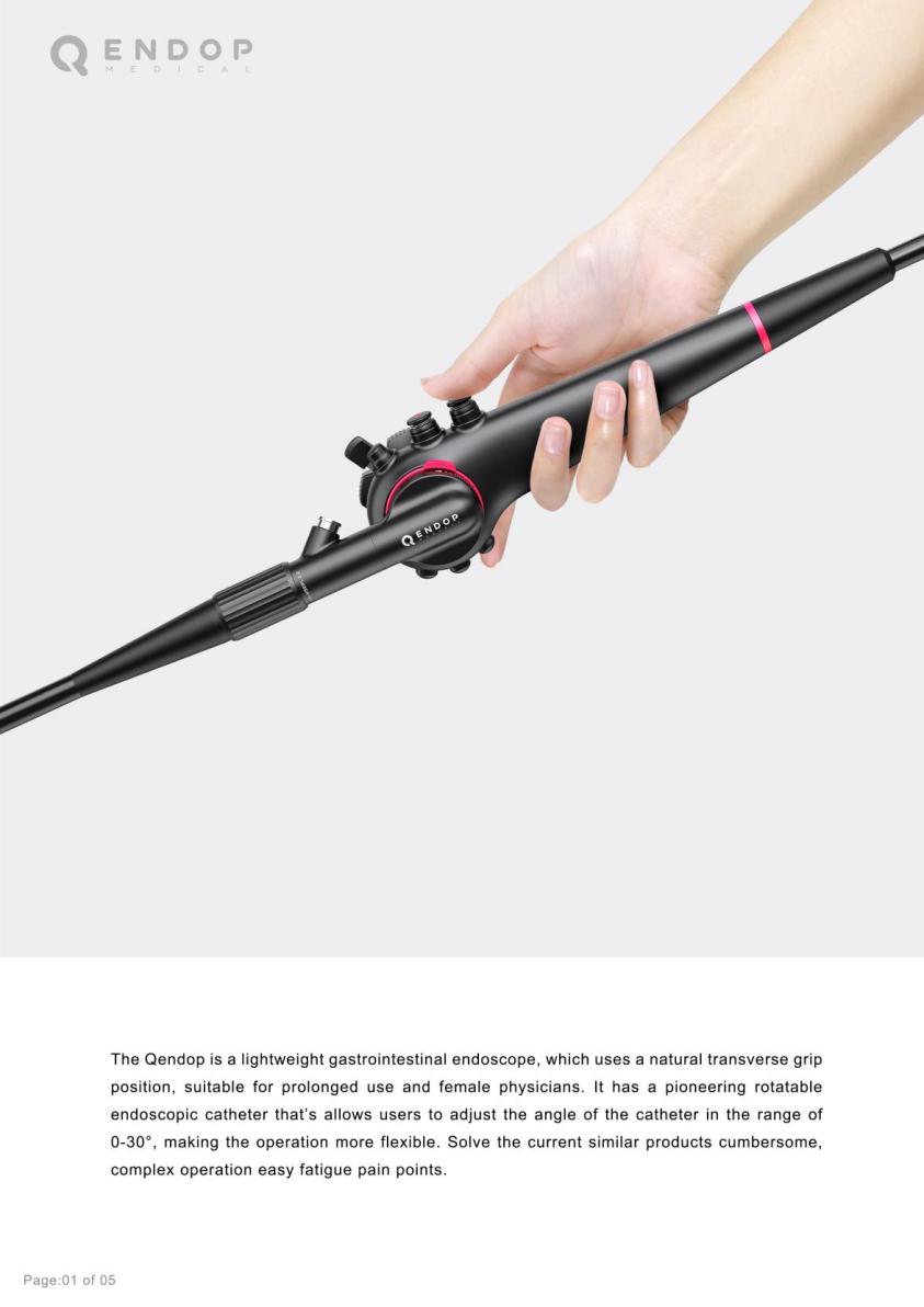 “Qendop是一种轻型胃肠道内窥镜,采用自然的反向抓握姿势,适合长期使用和女性医生。它有一个开创性的可旋转内窥镜导管,用户可以在0-30的范围内调整导管的角度,使操作更加灵活,解决了目前类似流程繁琐、操作复杂易疲劳的痛点。”