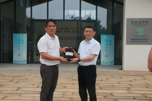 签约仪式结束后,塞尚一行参观了教席大楼内宋代景德镇青白瓷、陶瓷古彩与现代陶艺、“走进非洲”主题陶瓷艺术展三个展厅的展陈作品。陈思雨博士向客人介绍了联合国教科文组织“陶瓷文化:保护与创新”教席在陶瓷文化保护、传承与创新,陶瓷文化交流等方面发挥的重要作用。