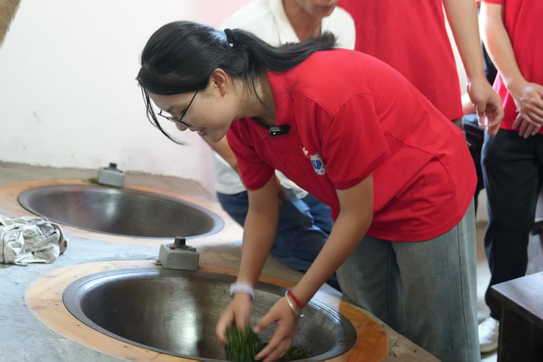在浮梁茶海,茶树如绿色波浪般随风起伏,郁郁葱葱的茶园茶香扑鼻。队员们不仅了解了茶叶种植培育知识,还亲身体验采茶、制茶等,近距离感受浮梁茶产业的蓬勃活力。在当地茶农的悉心指导下,队员们戴上竹编采茶篓,俯身穿梭于茶树间。他们轻捏嫩绿的茶芽,两指一提,小心翼翼地将鲜嫩的茶叶采摘下来,放入篓中。不一会儿,篓中便堆满了翠绿的茶芽,采摘结束后,队员们来到制茶工坊,亲身体验制茶的奇妙过程。