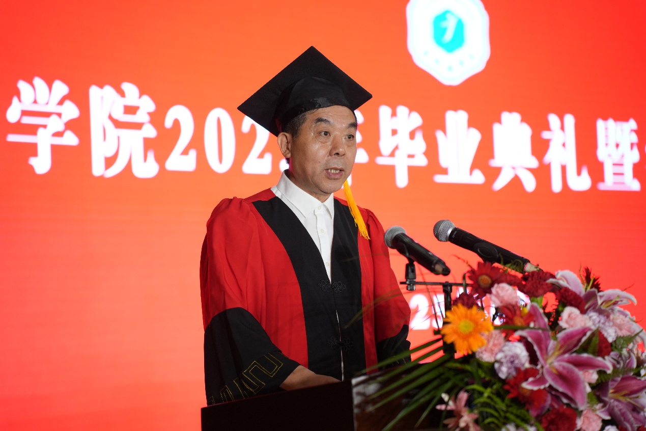 党委副书记、校长熊震宇代表学校向圆满完成学业的2025届毕业生们致以最热烈的祝贺!为即将奔赴星辰大海的学子,寄予最真挚的期许与祝福!随后熊震宇以“秉持校训精神,做攀登者、奉献者、先行者”为题,为全体毕业生讲授了一堂“毕业思政课”,带领同学们回顾了全校师生与国家发展同频共振、见证强国伟业的难忘历程,以及亲历校园环境优化与服务提升的温暖点滴。他高度肯定了毕业生在思想、学业、实践等多方面取得的丰硕成果。围绕校训“自强不息、泽土惠民”及“知行合一”的实践要求,殷切勉励毕业生坚持自强不息,做砥砺奋斗、敢破藩篱的攀登者;坚持泽土惠民,做赤诚报国、心有大我的奉献者;坚持知行合一,做埋头实干、勇立潮头的先行者,把青春播撒在民族复兴的征程上,跑好强国建设的接力棒。他表示,无论毕业生们未来奔赴何方,母校始终是大家精神的港湾,期待大家常回校园,共话成长、同绘新篇。