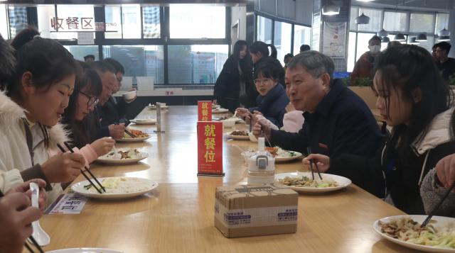 李良智在食堂和学生共进午餐,并亲切交流
