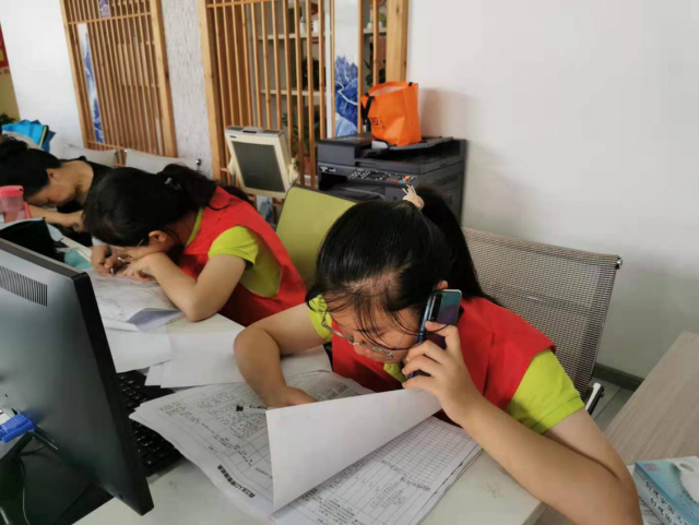 志愿服务队成员彭伶俐和江姗在通过打电话的方式登记疫苗接种情况