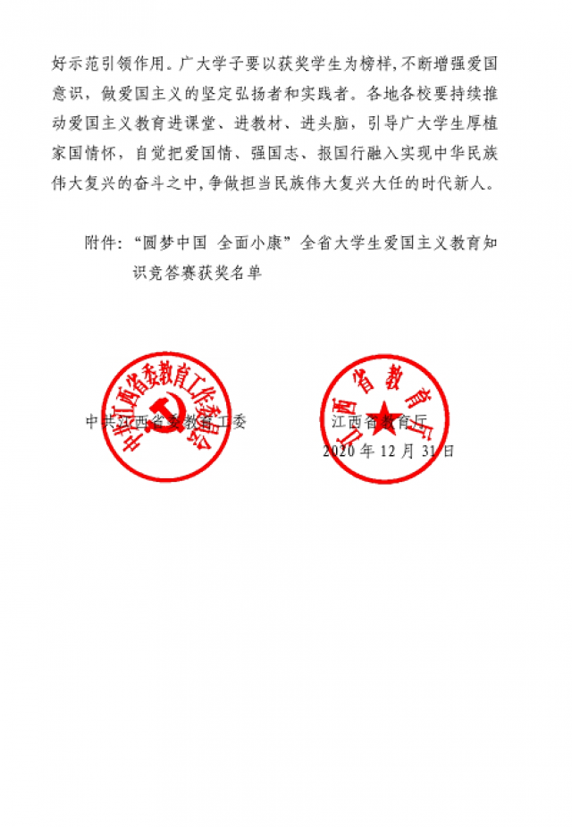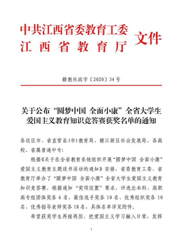 (本网讯徐欣鹏)近日,中共江西省委教育工委、江西省教育厅公布了“圆梦中国全面小康”全省大学生爱国主义教育知识竞答赛获奖名单,BEAT365官网分别荣获本科组“团体二等奖”、“优秀组织奖”,赵新被评为优秀指导教师、机电学院20级自动化1班涂鲲鹏荣获最佳选手奖。