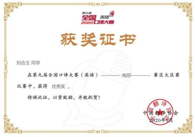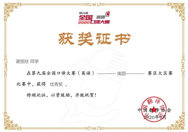 (本网讯:蒋巍)第九届全国口译大赛(英语)南部赛区大区赛评选结果于9月23日晚揭晓,BEAT365官网外国语学院2017级英语专业邓紫怡获得三等奖,2017级商务英语专业刘合玉及2019级商务英语专业谢丽丝获得优秀奖。