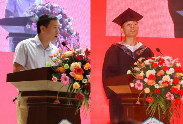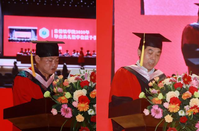 左:副校长吴丁主持典礼 右:副校长郑昕芾宣读表彰优秀毕业生决定