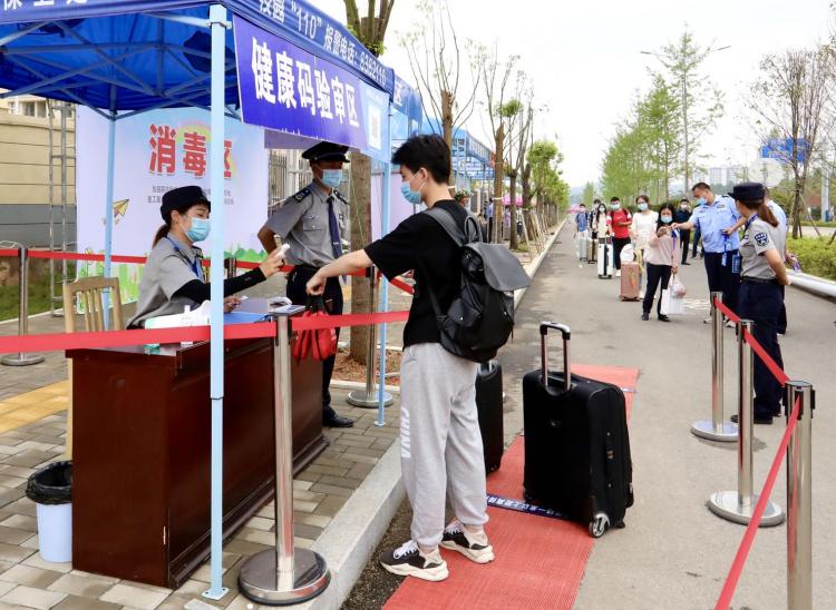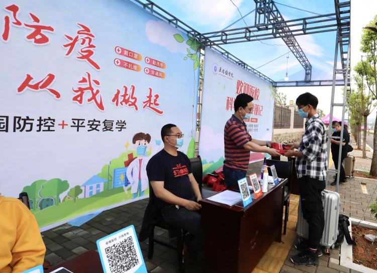 同学们佩戴口罩,根据标识牌,在工作人员的引领下,按照间隔线,保持安全距离,经过复学报到专用通道,排队安全有序地完成出示证件核对个人身份信息、查验健康码、体温检测、扫通行码、发通行证、行李消杀、填写相关信息完成入校登记等复学报到程序后,进入校园,回到宿舍。学校在学生报到等待区搭建临时雨棚,以应对天气变化;设置应急处置点,对健康码或体温异常学生进行问询复检,并根据情况决定正常回寝或带至隔离区进行医学观察。