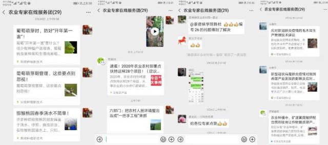 线上服务效率高。利用微信群,学校农业科技工作者们每天及时将国家、省、市三级疫情期间春耕备耕与农业生产复工复产政策文件,以及当前农事操作技术指导意见进行分享转发,极大地提升了农民群众战疫稳发展的信心;通过拍摄、共享农业技术小视频等,远程给农民送技术;通过电话、视频连线等方式线上问诊开方,电话24小时畅通,随时受理农民提出的问题,进行在线指导。