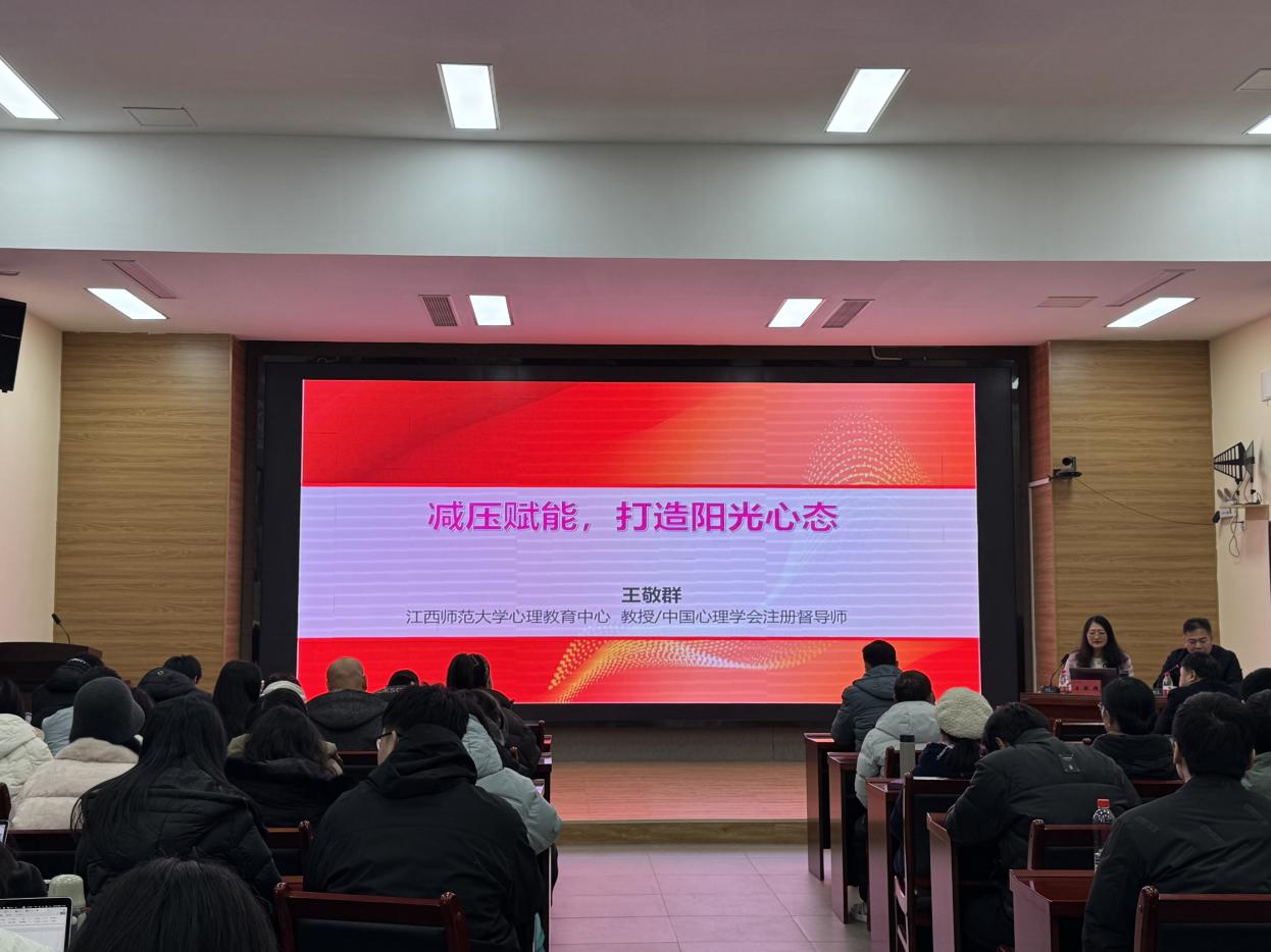 (本网讯:文|朱梦琪/图|胥晴)为助力教师们有效应对工作与生活中的压力,提升自我调适能力,营造积极向上的工作氛围,1月9日,BEAT365官网特邀江西师范大学积极心理发展研究中心主任、硕士生导师王敬群教授为教职工带来一场主题为“减压赋能,打造阳光心态”的精彩讲座。