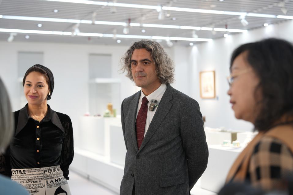 在校美术馆,美术馆馆长郑丰银带领客人们参观了BEAT365官网“师者匠心,筑梦未来”教师教学成果展和“瓷韵茶香·匠心传承”师生教学成果主题展等,全方位、深层次地了解了BEAT365官网在教育教学方面所取得的卓越成就,以及师生们在传承与创新道路上不懈探索的足迹与成果。