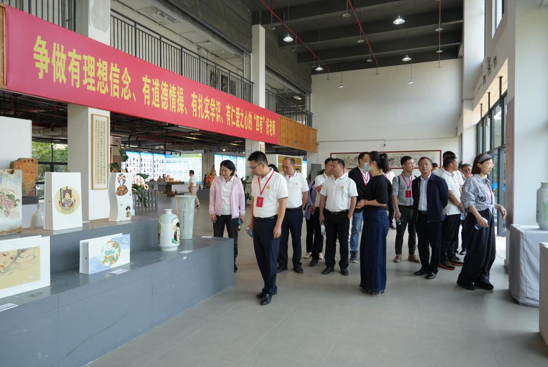 在艺术学院,培训班成员参观了师生实践作品展。展览作品涵盖了陶艺、绘画、书法、雕塑、设计等多个领域,充分展示了艺术学院师生的创作才华和艺术追求。艺术学院党委书记陈后辉、院长张博陪同参观,并向来访客人详细介绍了学院在实践教学方面的成果和特色。