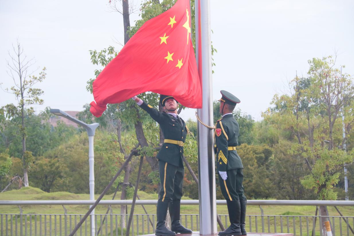 典礼在雄壮的国歌声中拉开帷幕,迎着冉冉朝阳,24级新生身着迷彩服,怀揣着梦想与希冀,排好方阵整齐屹立在田径运动场,注视着五星红旗升起。