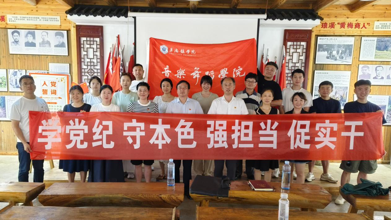 (本网讯:音舞轩)7月22日,音乐舞蹈学院党总支在中共河西县委旧址、革命传统教育基地——浮梁县蛟潭镇琅溪村开展“学党纪、守本色、强担当、促实干”主题党日,重温入党誓词,专题学习党的二十届三中全会精神。校党委副书记王丽心参加主题党日并以“深化党纪学习教育、遵守政治规矩,推进学校迈进高质量发展新征程”为题,为学院党员们上了一堂生动的党纪专题党课。