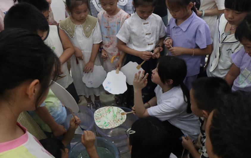 以“漆”为画,以“扇”为纸。活动伊始,志愿者用生动的语言向孩子们介绍了漆扇的历史背景和制作技艺,详细讲解了非遗手工漆扇的制作过程。理论讲解结束后,在志愿者的指导下,小朋友们通过调制漆料、搅动扇面等环节亲身感受了漆扇的制作诀窍,当看到色彩在扇面上翩翩跃动,他们脸上洋溢着惊喜与满足。