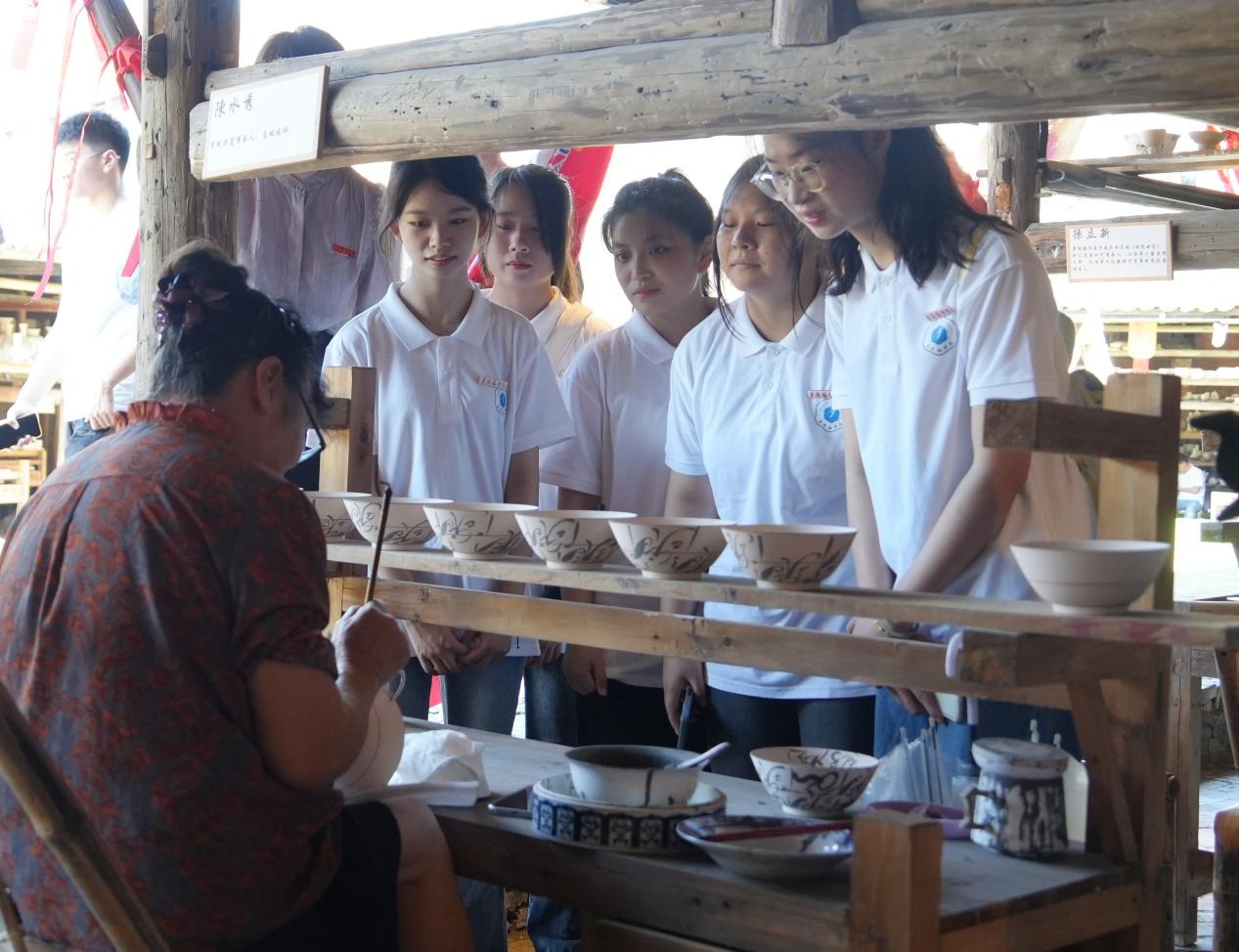 传统手工瓷是景德镇的标志,而柴窑的存在延续了这一传统,不仅是景德镇手工艺人的智慧与创造,更是这座城市延绵不息的灵魂。徐家窑内静静坐着勾瓷碗的非遗传承人陈水秀吸引了同学们的目光,她抚着细腻的瓷胎,熟练地填刻坯体上的图案,细腻的笔触间,青蓝与瓷坯体的相融,每一笔都是传统技艺的展现。老人家身上散发出来的孜孜不倦、一丝不苟和精益求精的工匠精神让同学们感叹不已。从泥巴成为素坯,经过装饰,最后入窑烧制成为作品,每一件都是匠人们的精湛技艺和匠心的沉淀,它不仅仅是物质的创造,更是文化的传承和精神的寄托。