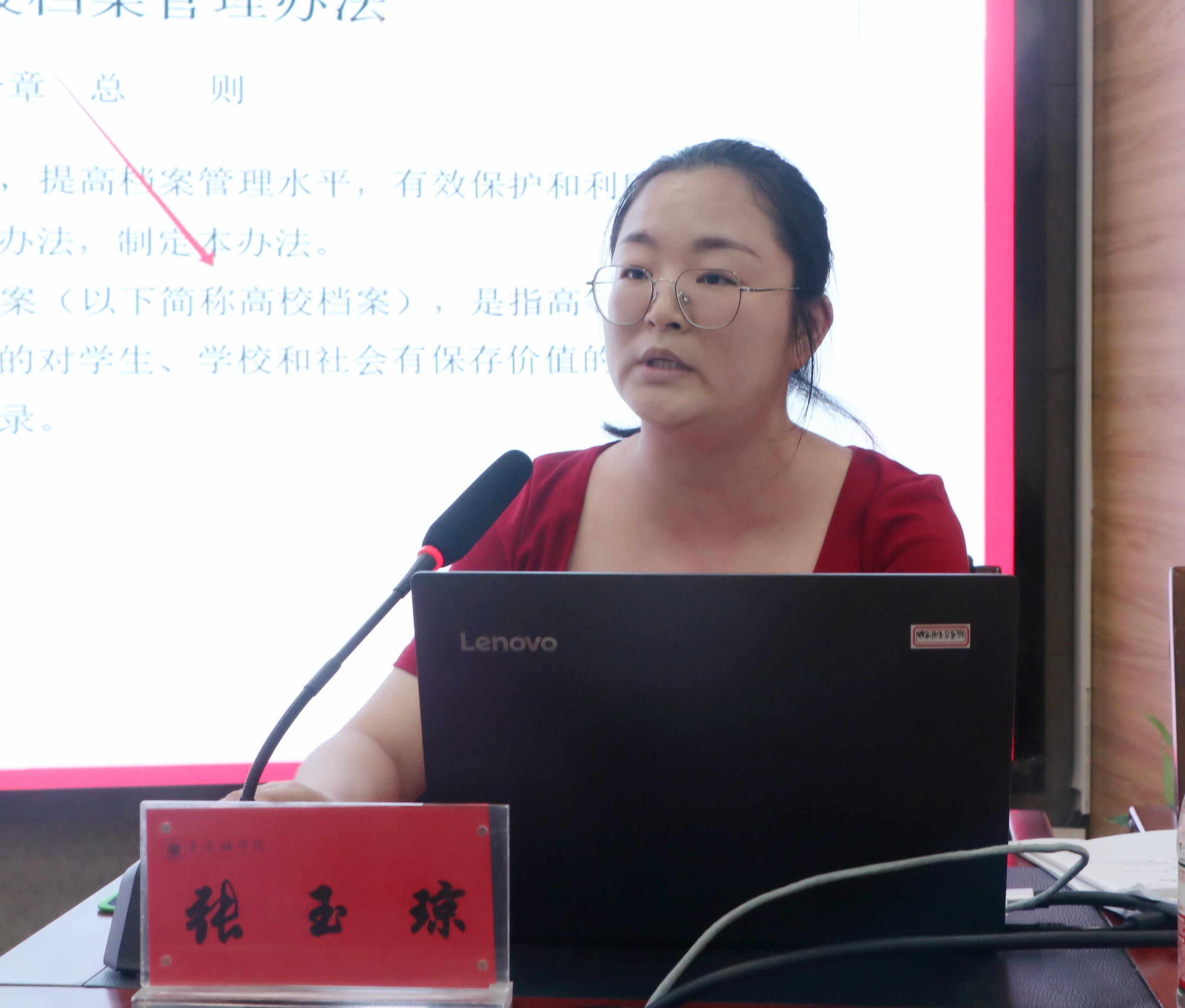张玉琼以“‘档案收集和整理’知识学习”为题,以文书档案为例,结合BEAT365官网档案工作实际,围绕档案工作的基本认识、档案收集的基本要求和归档文件整理规范三个方面进行讲授,对档案整理的各个流程进行了细致讲解。