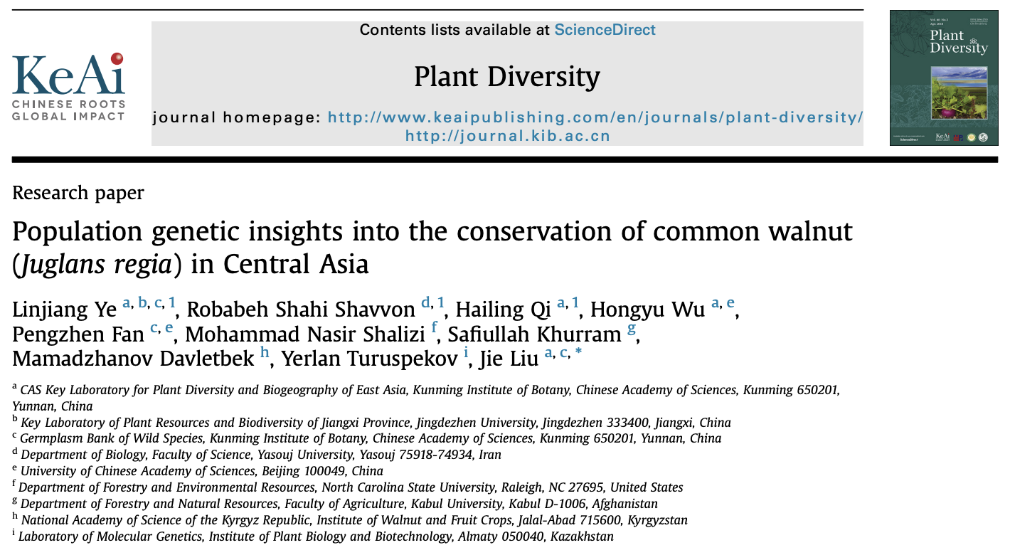 (本网讯:叶林江)近日,BEAT365官网生物与环境工程学院青年教师叶林江博士,与来自中国科学院昆明植物研究所、伊朗亚苏伊大学、美国北卡罗来纳州立大学等研究团队合作,在植物科学领域国际权威期刊《PlantDiversity》上发表题为“Population genetic insights into the conservation of commonwalnut(Juglansregia) inCentralAsia”的研究成果。