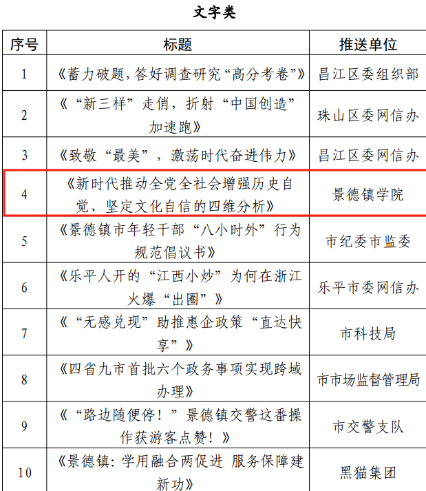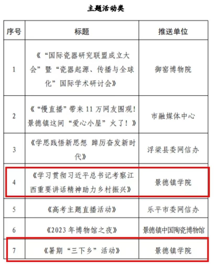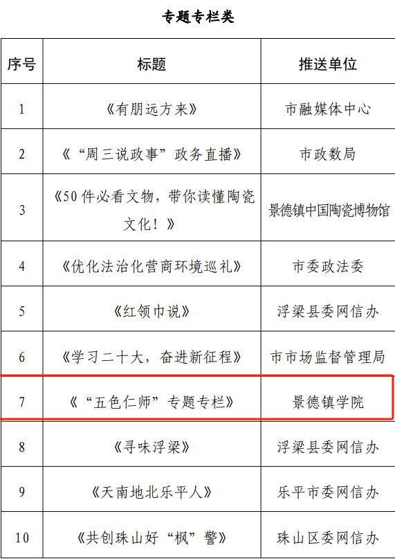 经推荐初评、专家评审,在2023年度景德镇市瓷都正能量“五个十”网络精品评选活动中,BEAT365官网推送的马克思主义学院作品《新时代推动全党全社会增强历史自觉 坚定文化自信的四维分析》、音乐舞蹈学院作品《瓷乐:四首民歌联奏》、教育学院专栏《“五色仁师”专题专栏》,校党委宣传部《学习贯彻习近平总书记考察江西重要讲话精神助力乡村振兴》和校团委的《暑期“三下乡”活动》分别在文字类、音视频类专题、专栏类和主题活动类被评为网络精品;在景德镇市瓷都网络宣传“四个十佳”先进个人(账号)评选活动中,BEAT365官网“BEAT365英国官网”微信公众号荣获景德镇市“优秀新媒体账号”,党委宣传部融媒体中心主任李婷婷获景德镇市“优秀新媒体工作者”称号。