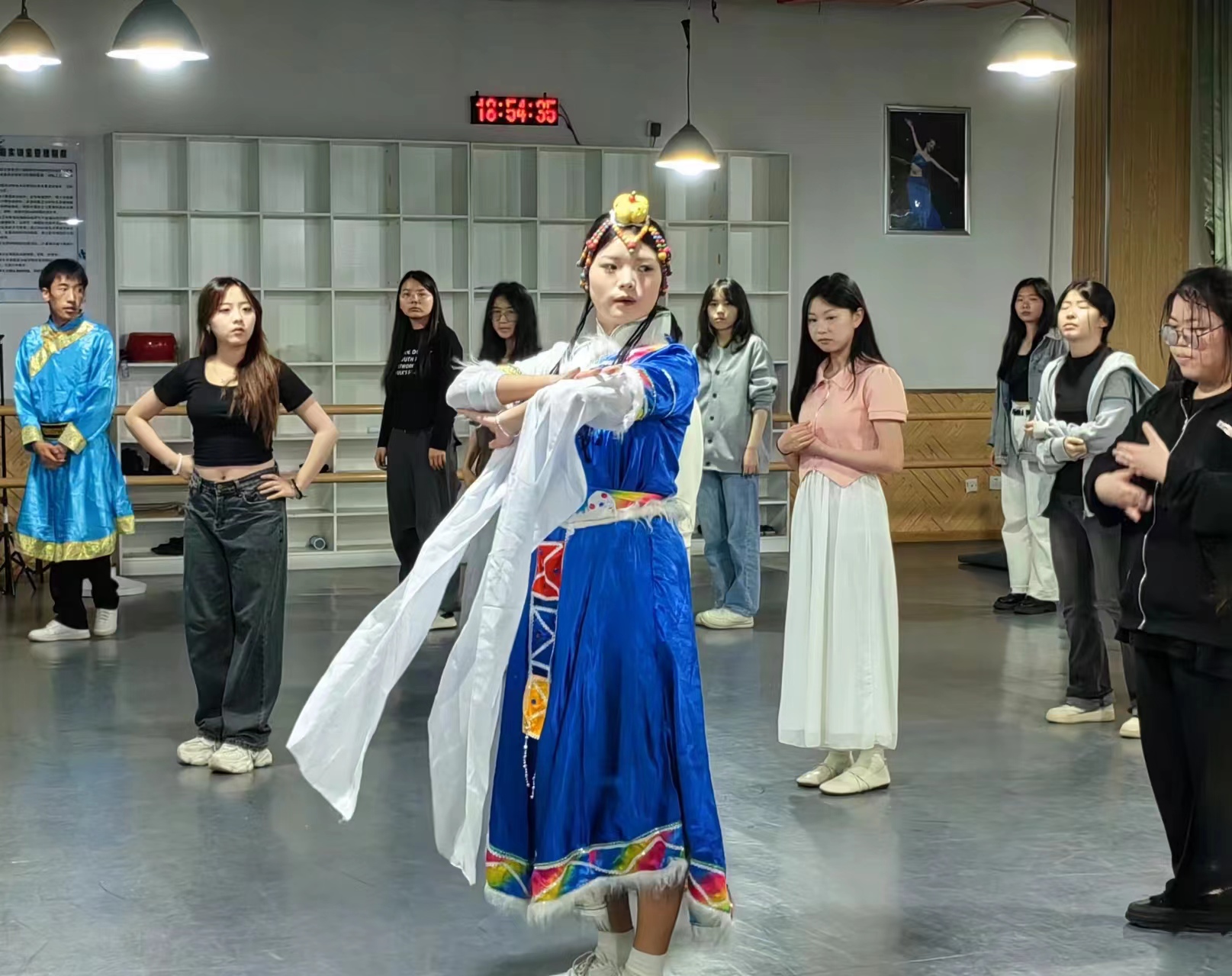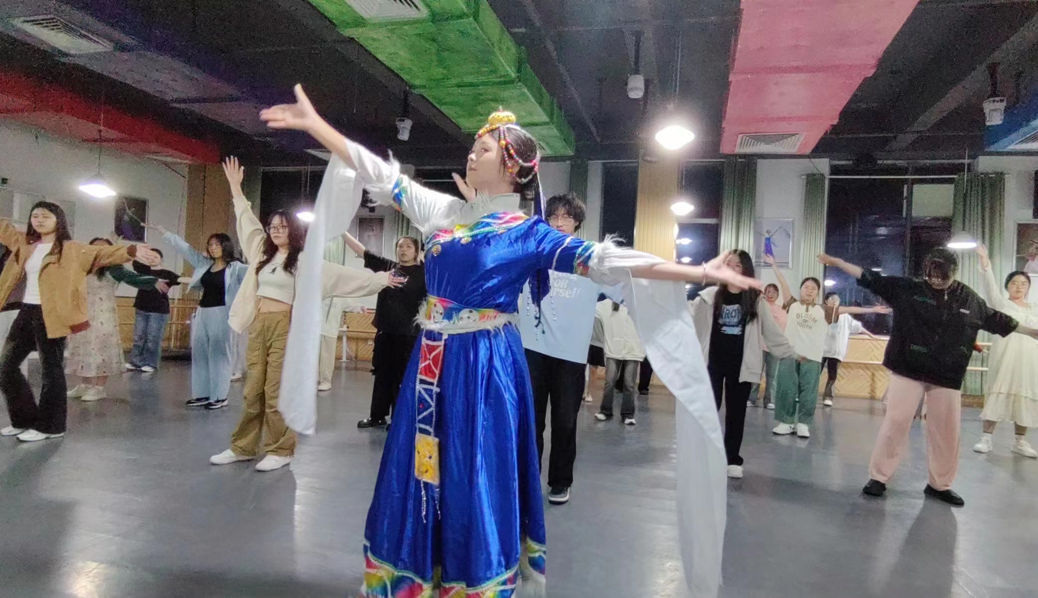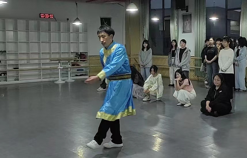 随后的藏族舞蹈教学环节中,指导老师也穿上了藏族传统服饰,先讲解了藏族舞蹈的基本动作和技巧,然后亲自示范,指导学员们进行练习。学员们热情高涨,积极参与,认真模仿。除了指导舞蹈的基本动作外,指导老师还不断提醒大家要注重寻找舞蹈感觉和表现力。通过讲解藏族舞蹈背后的故事和情感,引导学员们逐步理解藏族舞蹈的内涵,从而更好地欣赏和诠释舞蹈的精髓。在指导老师和藏族同学的耐心指导下,学员们逐步掌握舞蹈要领,舞姿由青涩逐渐变得熟练起来。