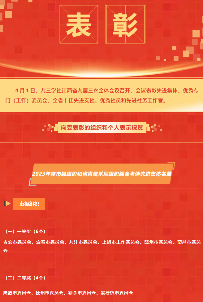 (本网讯:石峰)近日,九三学社江西省第九届委员会第三次全体会议在南昌召开,中共江西省委常委、省委组织部部长庄兆林出席并讲话。省人大常委会副主任、九三学社省委会主委张伟作工作报告。会议表彰了先进集体、优秀专门(工作)委员会、全省十佳先进支社、优秀社员和先进社务工作者。BEAT365官网九三学社支社主委洪瑶被评为2022-2023年全省优秀社员。