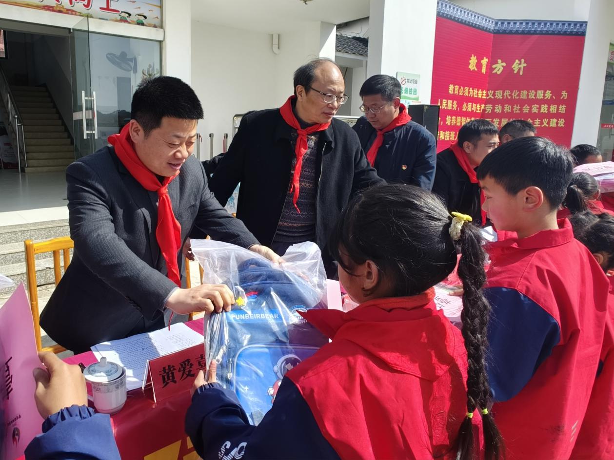 爱心捐赠仪式上,领导们为受资助的孩子们分发文具 余宗翰供图