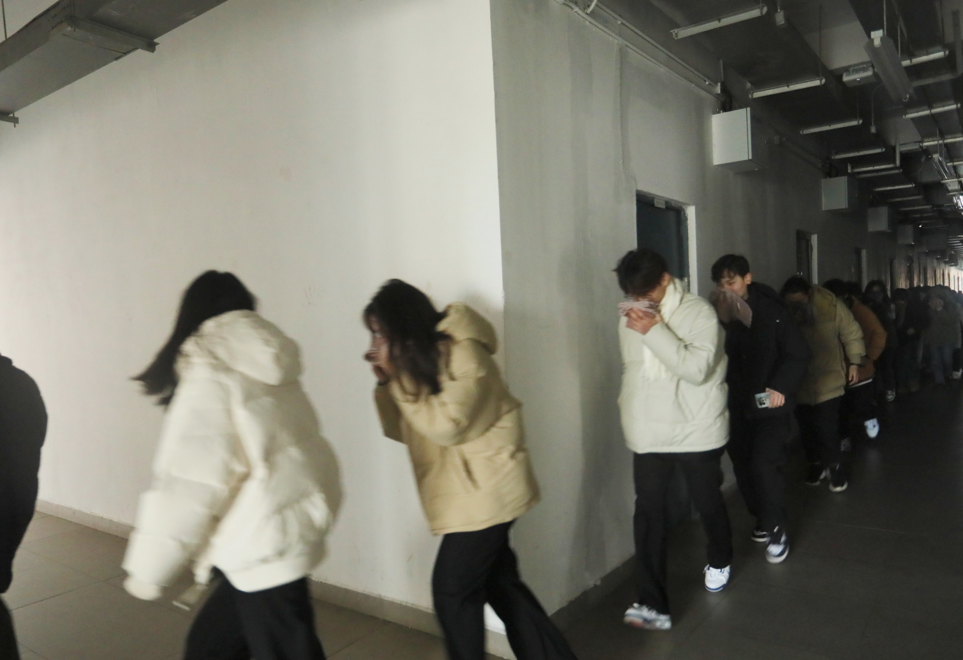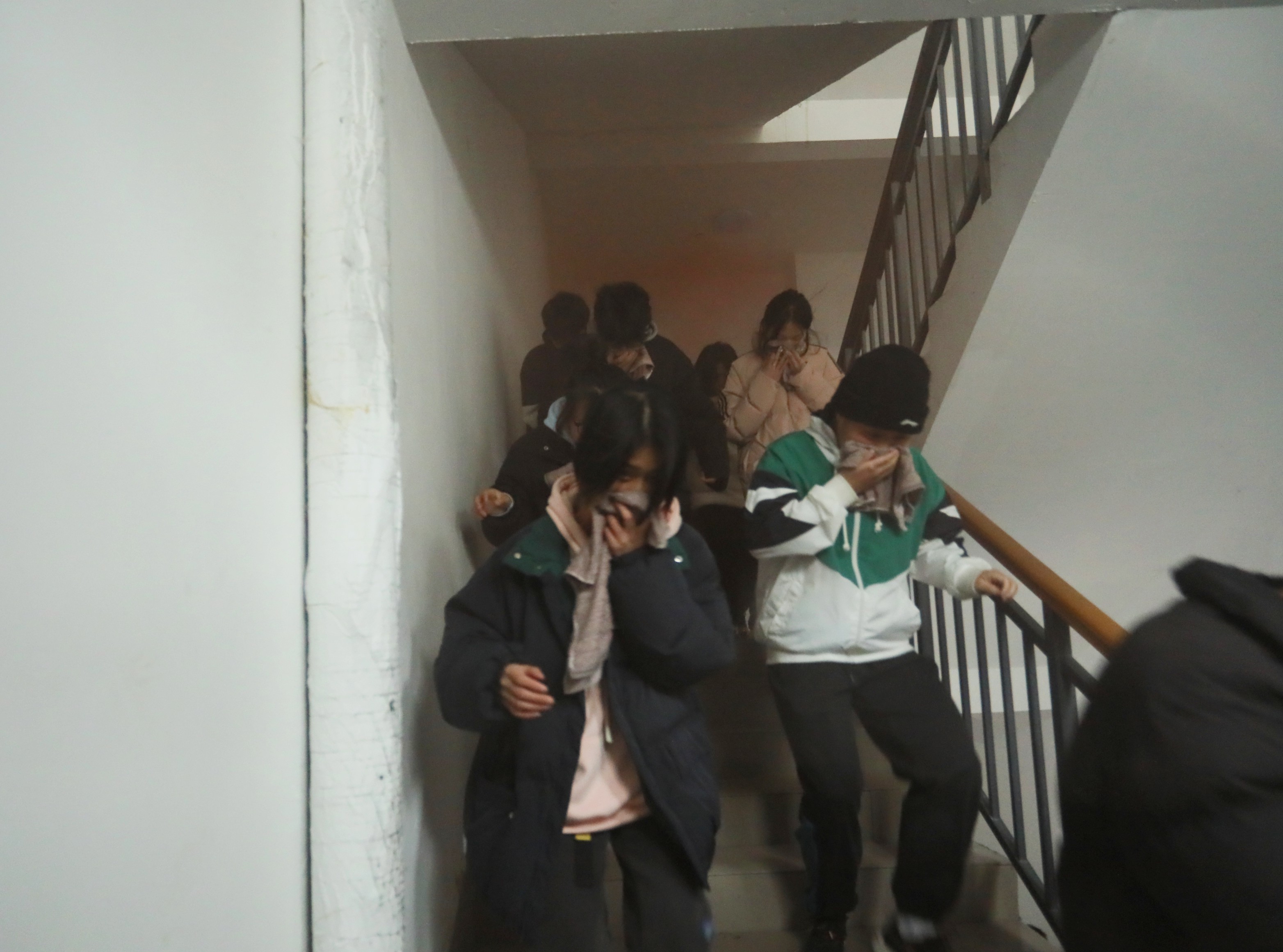 预设警报声响起,应急疏散演练开始。学生们听到警报声时,用手捂鼻,弓身,贴着墙脚,保持着安全距离,沿着指定路线快速从安全出口疏散。整个疏散过程,没有出现拥挤推搡现象,做到了井然有序。参加演练的全体人员整齐、有序撤离宿舍或教学楼等建筑的各楼层(主要为低楼层),整个过程仅用1分半钟。各部门分工明确、协调联动、处置果断有力,相关工作人员在相应岗位引导、护送学生有序撤离到达安全区域。整个演练过程完整模拟了从警报响起到紧急疏散的过程。此次演练增强了学校处置突发火灾事件的能力,带领大家学习到更多的消防安全知识,防患于未“燃”,为学生掌握平安逃离火灾现场实操知识奠定了坚实基础。