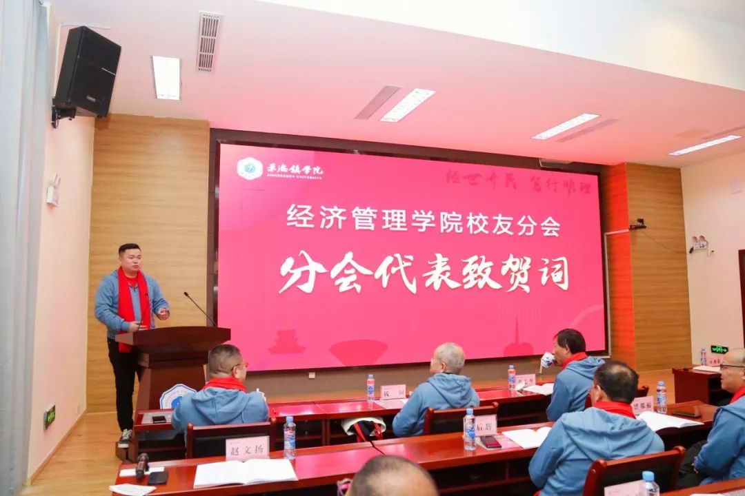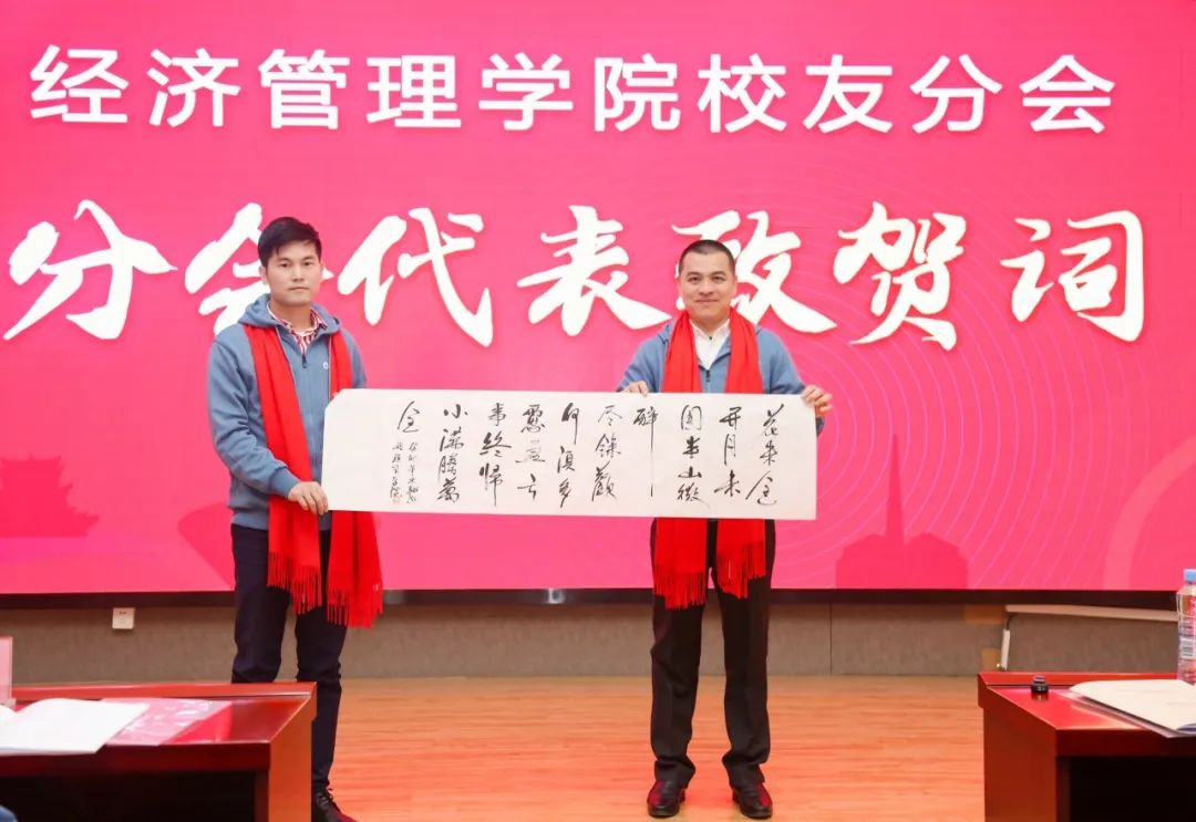 会上,王振华致欢迎辞,会长崔永健发表就职感言,他表示,感谢老师、校友们在校友会成立过程中给予关心和帮助,经济管理学院校友分会将时刻不忘母校培育之情,绝不辜负广大校友殷殷期望,谨记校训、薪火相传、服务校友、携手并进,共创校友分会的美好明天。随后,崔永健带着校友代表为经济管理学院赠送礼物,以感谢学院和老师多年的教导和栽培之恩。