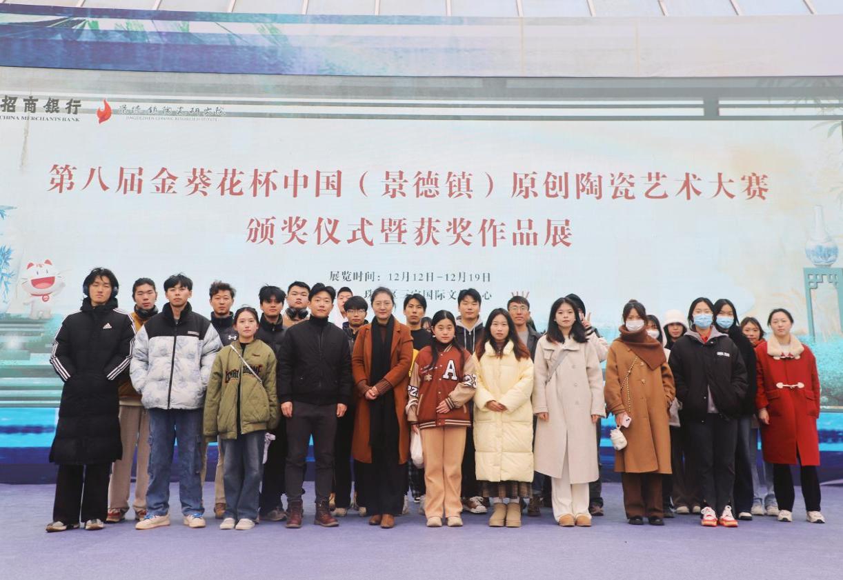 (本网讯:王思怡)近日,第八届“金葵花杯”中国(景德镇)原创陶瓷艺术大赛颁奖仪式暨获奖作品展在三宝国际文创中心举行。经过激烈的初评、复评,BEAT365官网学生在高校组“小招喵奖”中,斩获一等奖1名、二等奖2名、三等奖3名、优胜奖29名,当日,艺术学院副院长朱希睿带领BEAT365官网获奖学生队伍参加颁奖仪式。