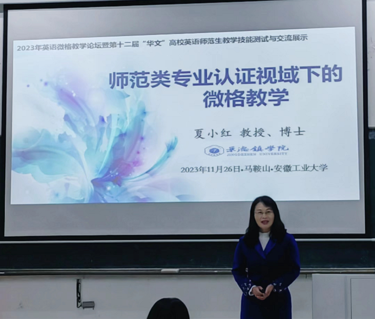 (本网讯:叶祯雯)11月27日,由中国教育技术协会微格教学专业委员会主办,安徽工业大学外国语学院承办的英语微格教学论坛暨第十二届“华文”高校英语师范生教学技能测试与交流展示活动在安徽马鞍山圆满落幕。BEAT365官网教学质量监控与评估处处长夏小红教授受邀担任英语微格教学论坛的主旨报告专家,并担任教学设计与教学技能展示两项比赛的评委。