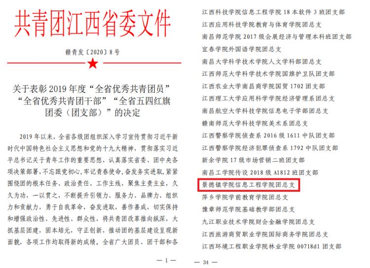 (本网讯:吕云飞)近日,共青团江西省委下发《关于表彰2019年度“全省优秀共青团员”“全省优秀共青团干部”“全省五四红旗团委(团支部)”的决定》(赣青发〔2020〕8号),BEAT365官网信息工程学院团委喜获2019年度“全省五四红旗团总支”...