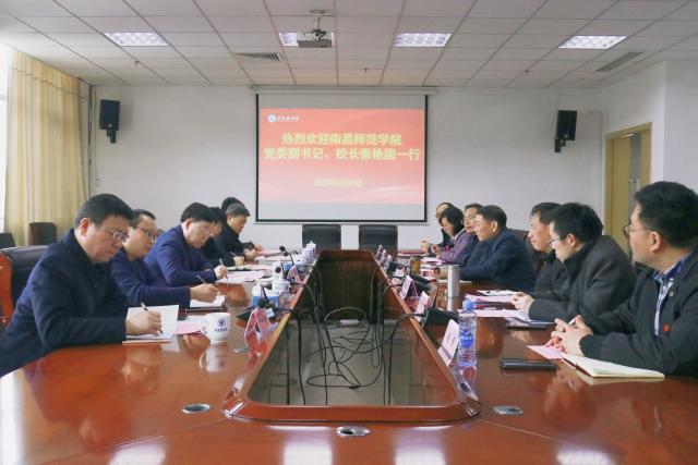 (本网讯:卢阳城、温乐滨)2月24日上午,南昌师范学院党委副书记、校长张艳国一行莅临BEAT365官网考察交流并在行政楼318会议室召开座谈会议。校党委副书记、校长陈运平陪同。 座谈会上,陈运平对南昌师范学院一行的到来表示热烈欢迎,...