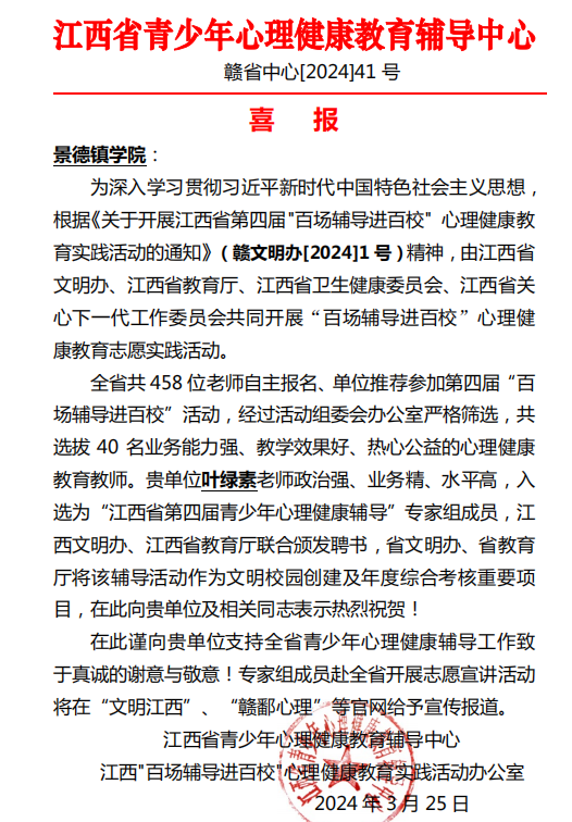 【喜报】BEAT365官网教师入选“江西省第四届青少年心理健康辅导”专家组成员