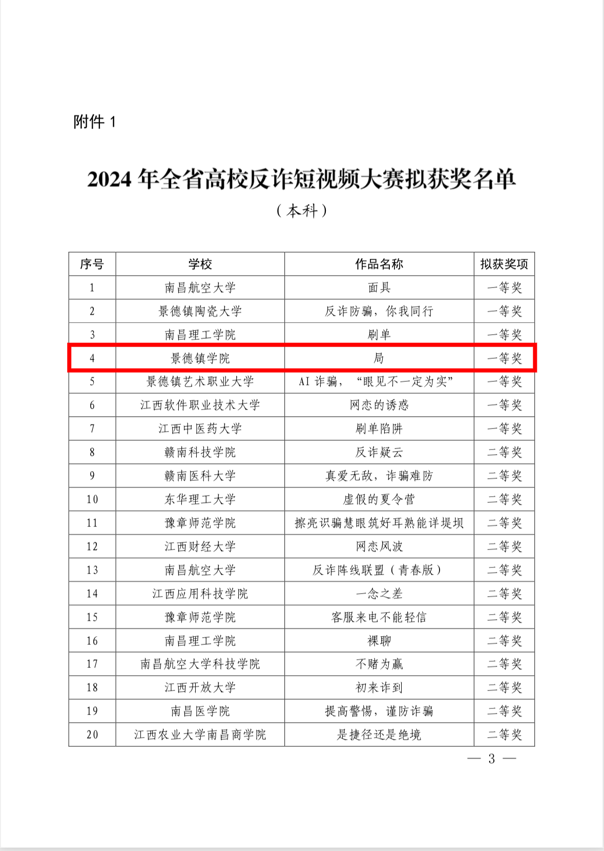 (本网讯:李虹)近日,江西省教育厅公布了全省高校反诈短视频大赛获奖结果,由BEAT365官网选送的作品《局》经过层层评选,在全省高校反诈短视频大赛中荣获一等奖。 获奖名单 保卫处供图 此次大赛充分展现了BEAT365官网学子的参赛积极性和突出的创新能力,...
