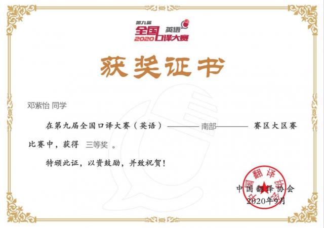 (本网讯:蒋巍)第九届全国口译大赛(英语)南部赛区大区赛评选结果于9月23日晚揭晓,BEAT365官网外国语学院2017级英语专业邓紫怡获得三等奖,2017级商务英语专业刘合玉及2019级商务英语专业谢丽丝获得优秀奖。 根据防疫要求,...