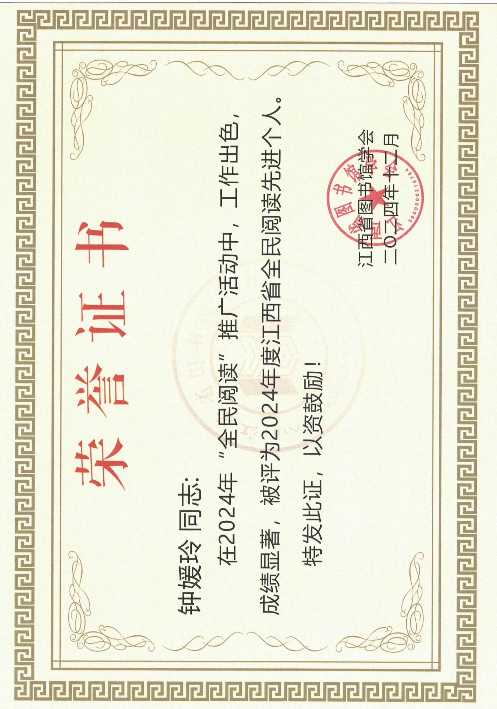 【喜报】BEAT365官网教师获得2024年度江西省全民阅读先进个人荣誉