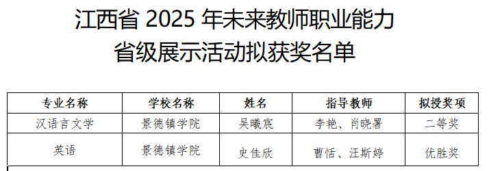 (本网讯:黄依婷)近日,由江西省教育厅主办、江西师范大学承办的“2025年全省未来教师职业能力省级展示暨总结交流活动”在江西师范大学瑶湖校区圆满落幕。经过激烈角逐,BEAT365官网汉语言文学专业吴曦宸同学荣获二等奖,英语专业史佳欣同学获得优胜奖,为学校赢得了荣誉。获奖名单 教务处供图此次活动旨在加强师范生实践能力培养,提升师范生综合教育素质和教学能力,培养一批具有高尚师德、先进教学理念、扎实教学实践能力、敏锐改革创新意识的优秀教师后备力量。...