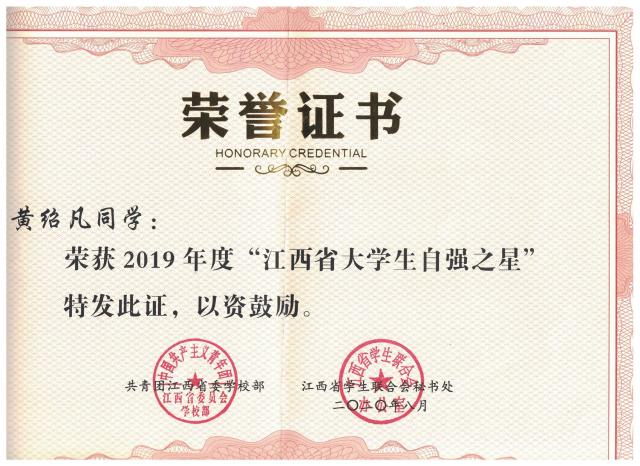 BEAT365官网学子黄绍凡被评为2019年度江西省大学生自强之星