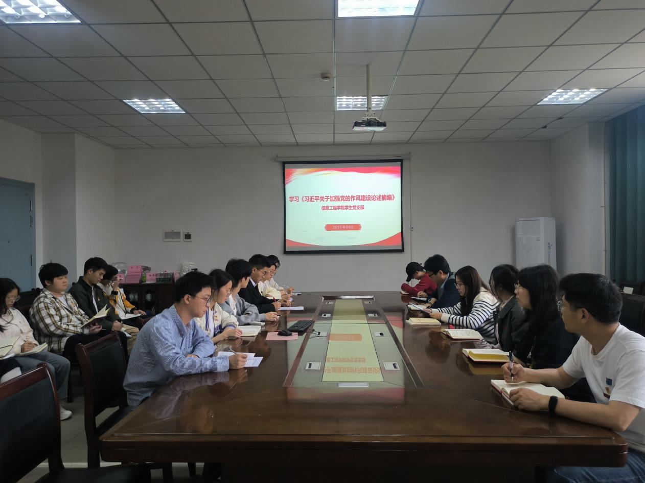 (本网讯:文|高梅/图|金哲源)为深入贯彻中央八项规定精神学习教育,筑牢思想根基,引导党员准确把握党的作风建设的核心要义,推动党员将作风建设理论转化为实际行动,4月16日下午,信息工程学院学生党支部在学院会议室开展《习近平关于加强党的作风建设论述摘编》读书分享会。